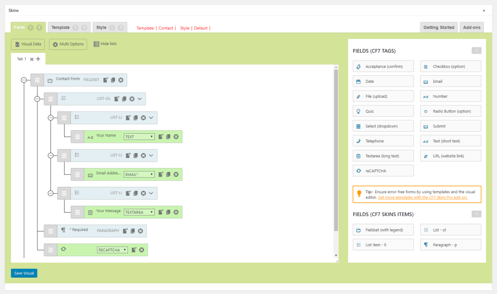 CF7 Skins puts all form fields within HTML lists to make styling easy & consistent. This gives great control but is challenging & confusing for novice WordPress users.