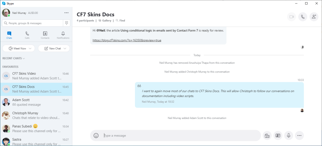 NOTE: The distinction between Chats, Messages & Comments is only in how we see these items – in reality in Skype there is no difference, they are all delivered by exactly the same functionality.