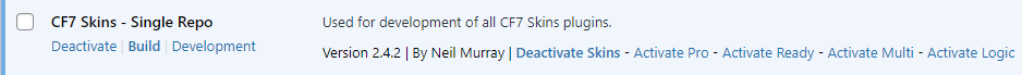 Once the CF7 Skins Development plugin is active, you can de-activate individual plugins or switch between Development and Build versions.
