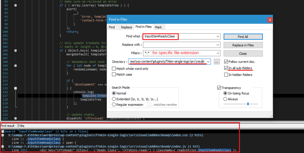 We know it is filed in /src/visual, and using Notepad++, search the string “Find in Files” in the directory.