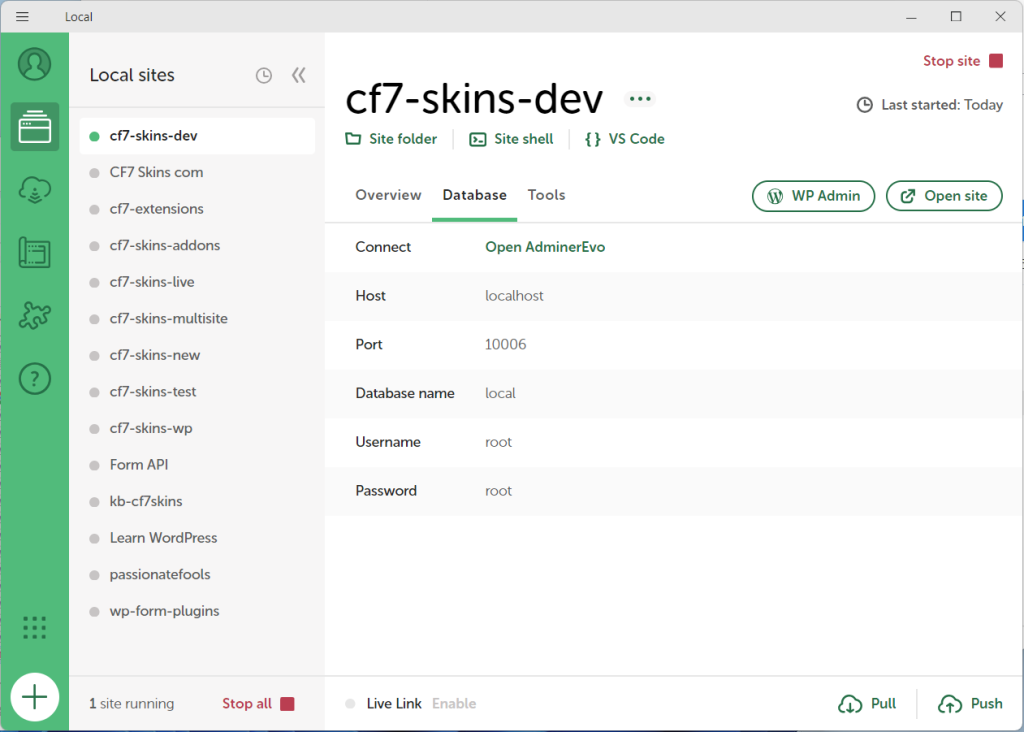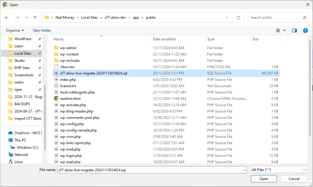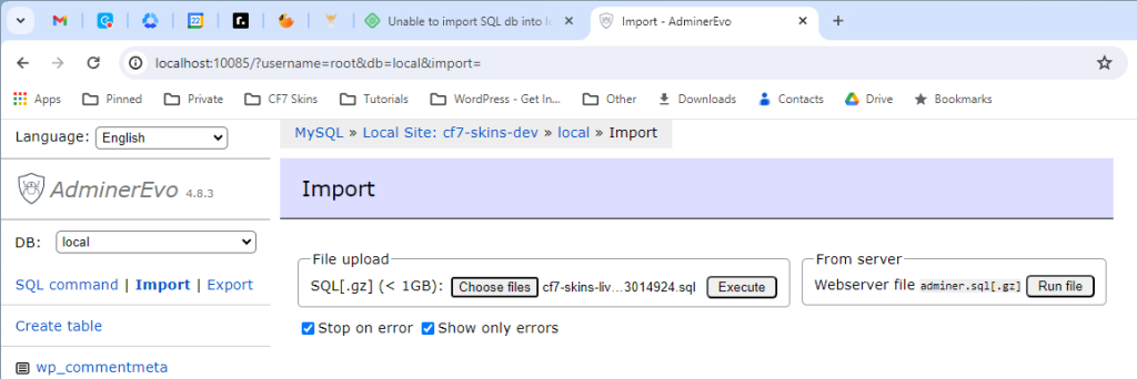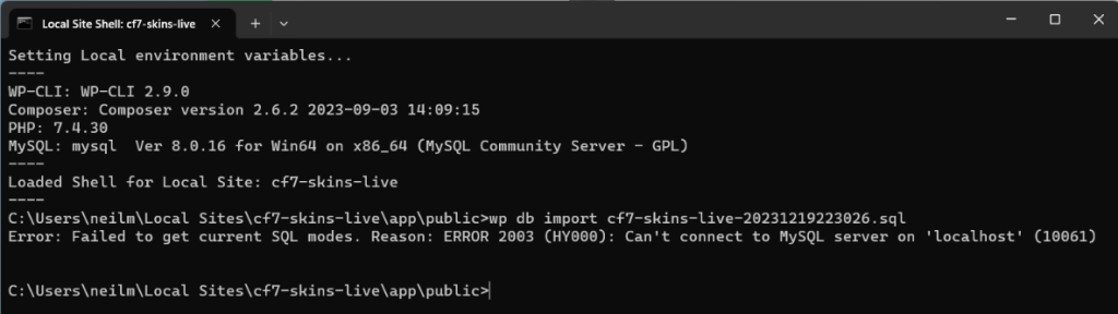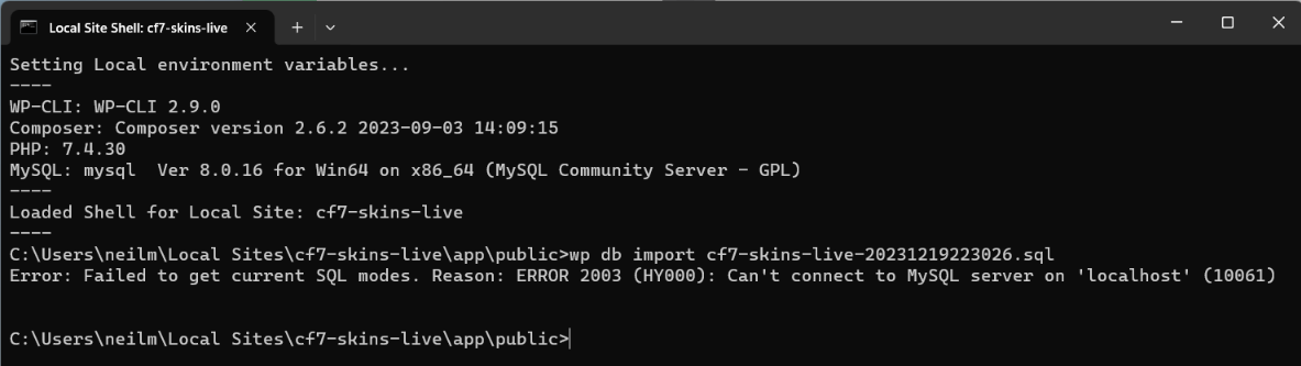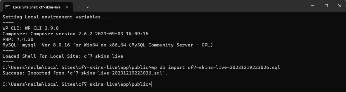 But using the wp-cli command wp db import cf7-skins-live.sql in Local Site Shell does not sometimes work on Windows.