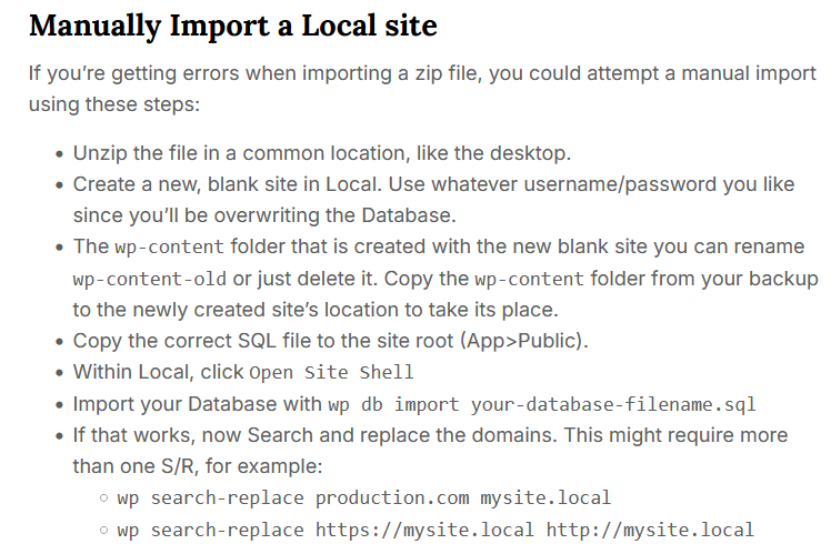 If you have problems importing a large zip file of an existing site, the Local Documentation suggests doing a Manual Import as explained below.