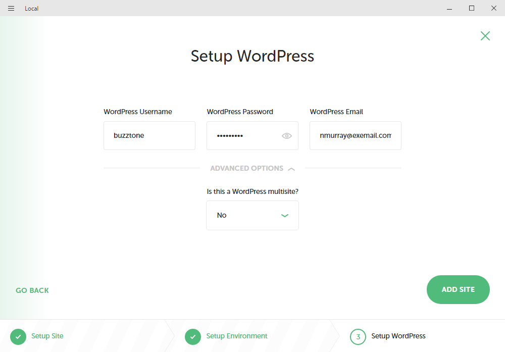 Choose Advanced Options if you want a WordPress Multisite install.