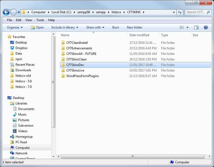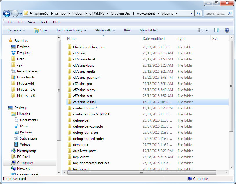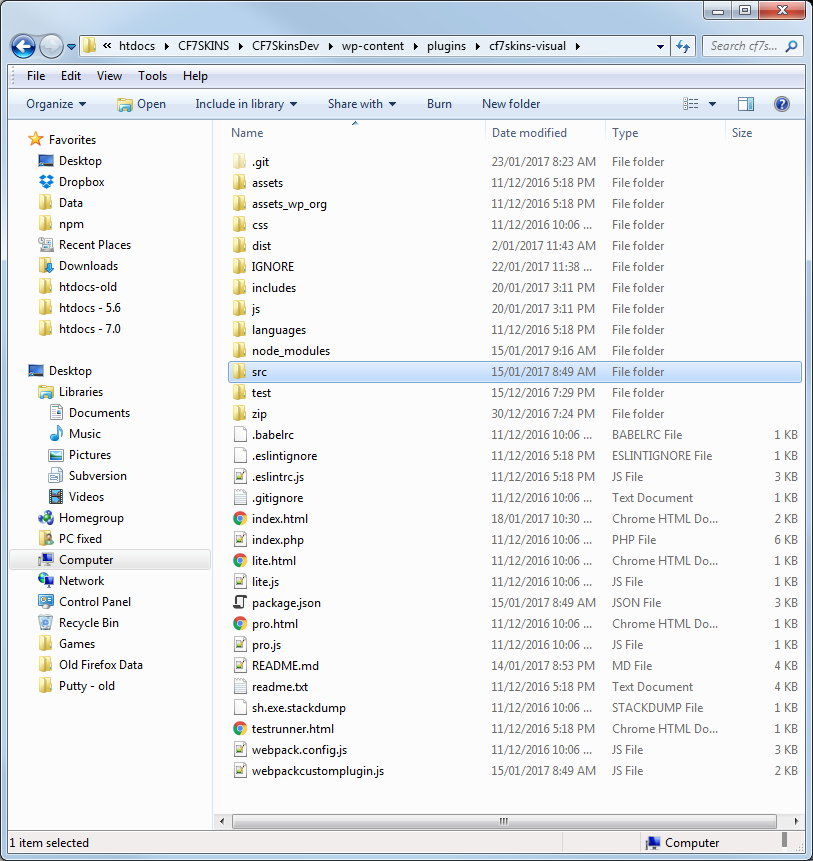 Each CF7 Skins project is setup in the WordPress plugins folder.