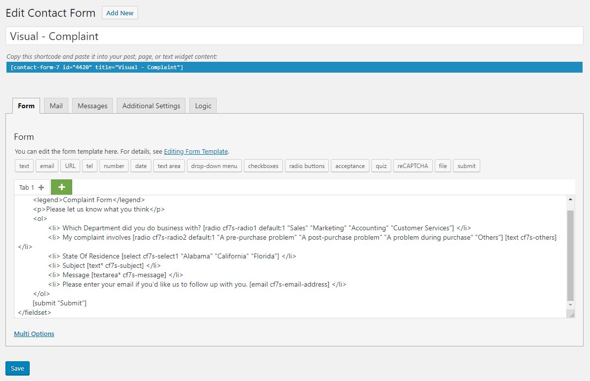 Use Save Visual to add the entire form to the CF7 Form tab, which you can then copy.