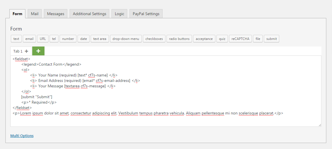 <fieldset> <legend>Contact Form</legend> <ol> <li> Your Name (required) [text* cf7s-name] </li> <li> Email Address (required) [email* cf7s-email-address] </li> <li> Your Message [textarea cf7s-message] </li> </ol> [submit "Submit"] <p>* Required</p> </fieldset> <p>Lorem ipsum dolor sit amet, consectetur adipiscing elit. Vestibulum tempus pharetra vehicula. Aliquam pellentesque mi non scelerisque placerat.</p>