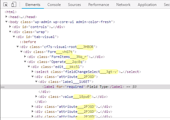 Whenever a new build of CF7S Visual is created (either by the development server npm start or with webpack), all Component class names are automatically suffixed with a unique combination of alphabets and digits by CSS Modules.
