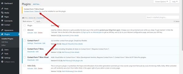 NOTE: You will also need to download, install & activate CF7 Skins Pro to operate the CF7 Skins Visual plugin and any other CF7 Skins Add-ons – see Install CF7 Skins plugins.