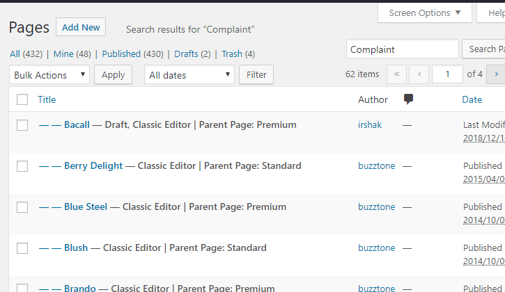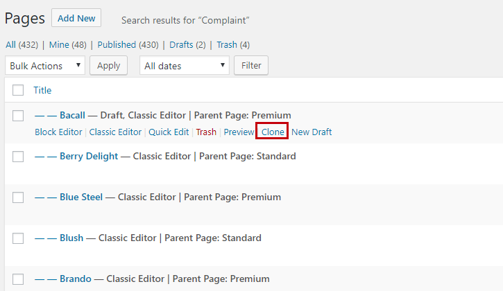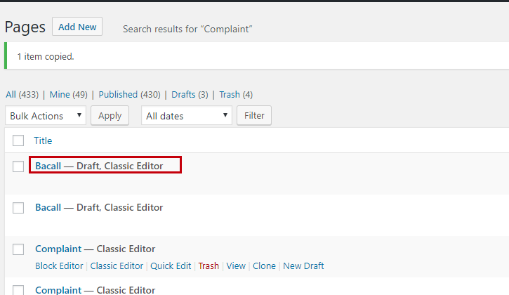 Once we click the clone link we can see the duplicated page on the pages list.