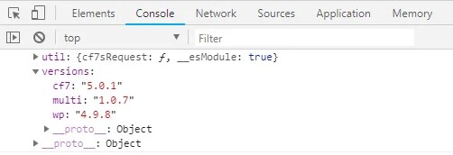 The version is added to window object cf7svisual in versions property. Here is the result using console logging: