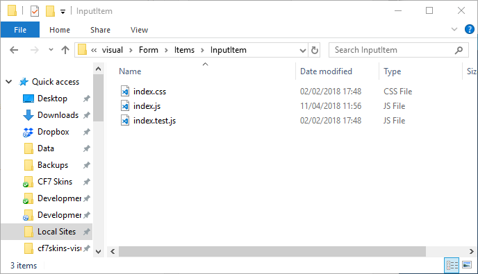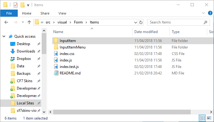 All files associated with an individual React component are contained in a single folder such as ..\cf7skins-visual\src\Form\Items\InputItem.