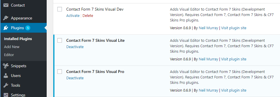 These plugins can be selectively activated in the wp-admin to test how the Visual Editor operates in our different CF7 Skins plugins: