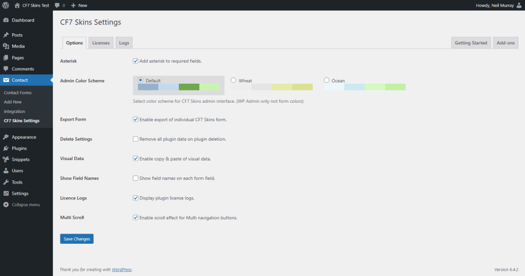 Admin Color SchemeExport Form– see #466: Move Import & Export to CF7 Skins Extra- Delete Settings – Remove all plugin data on plugin deletion.