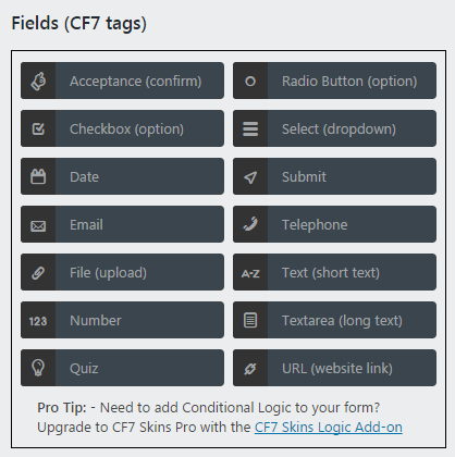 - You may not need to show all of the possible fields to all of your customers. Keep forms short & relevant with CF7 Skins Logic.