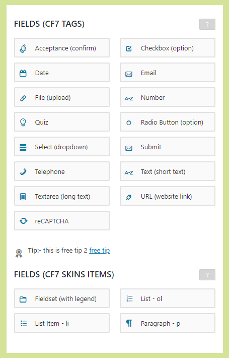 - Visually grouping similar fields together improves the flow of your form. A good way to do this is by drawing a box around the group using CF7 Skins Ready.