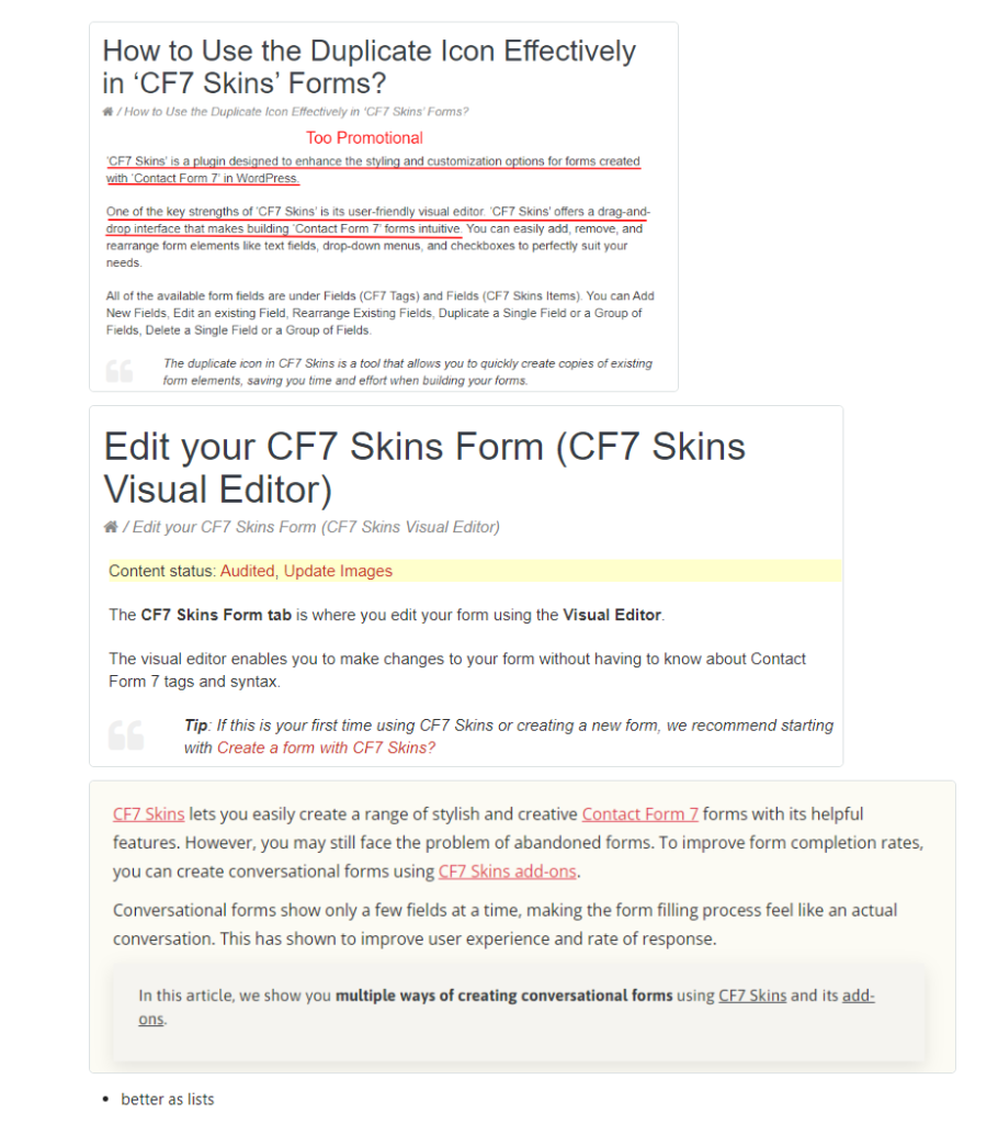 * “… it adds an extra tab where you can configure your form …” You copied this part directly from CF7 Skins documentation but you missed the part that this is valid only for the “Form” section at the top. The “Skins” section already has a “Logic” tab. Since this post only focuses on the Visual Editor, you only need to discuss that part.