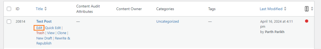 Under all posts, locate the desired post or page, that you want to duplicate, or that you want to make changes in an existing post written by someone else. Here, near the title of the post, you would see a few options: