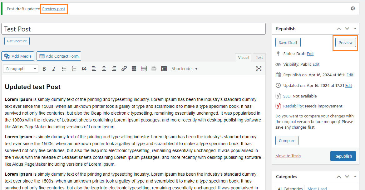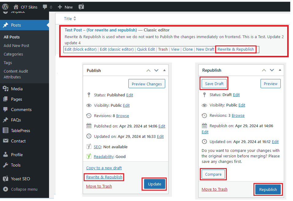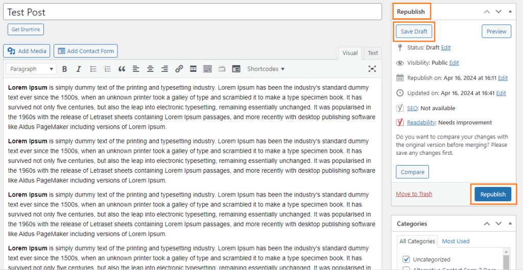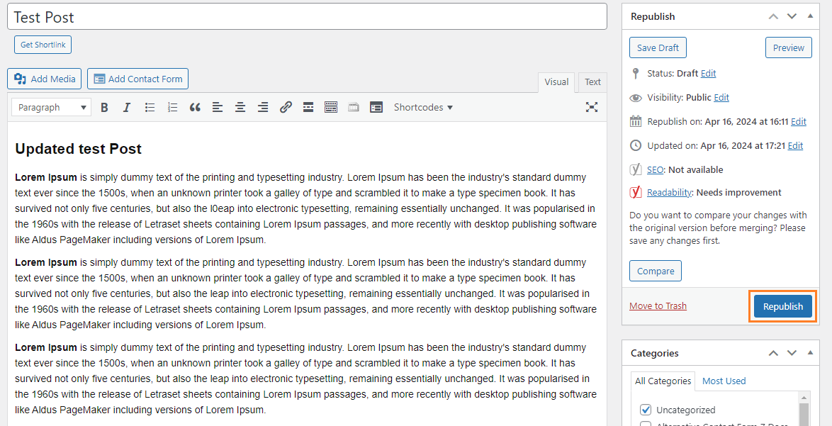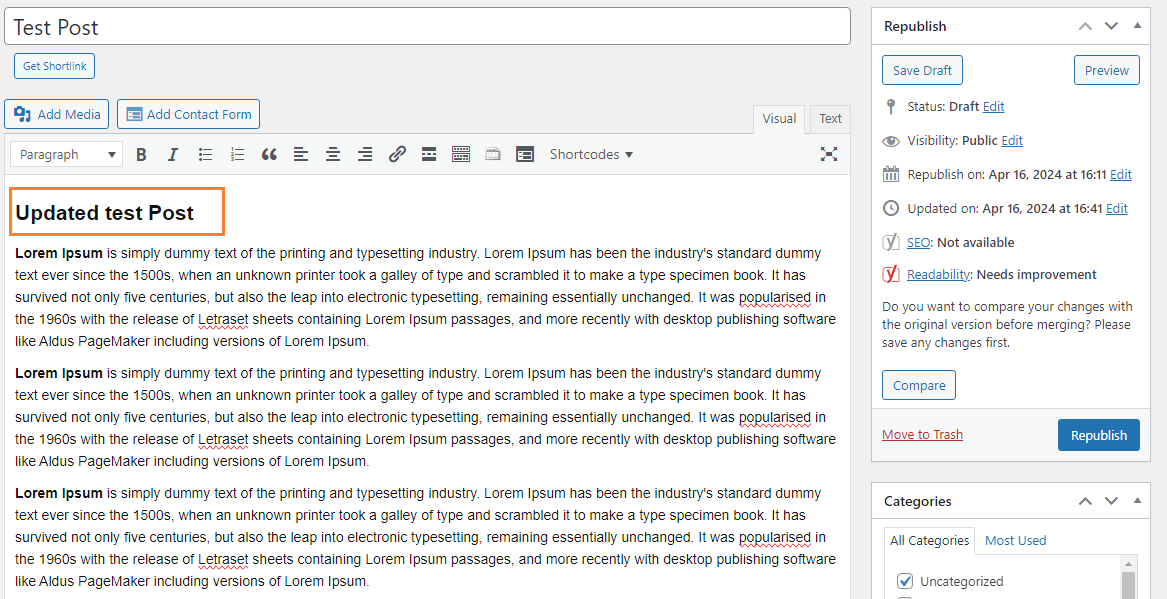 Once you are satisfied with the changes and ready to update the original post/page with the revised content, use the “Republish” option. This overwrites the original post/page with the updated content and publishes it on the frontend.