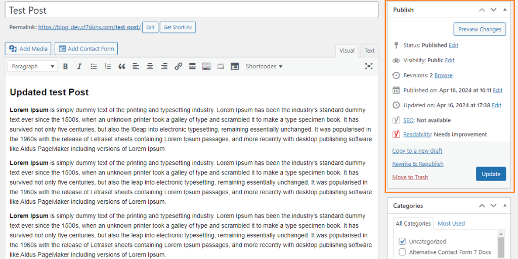 After making edits to the duplicated content, use the “Update“ button to save the changes without publishing them immediately. This allows you to refine the content further or review the modifications before publishing them on the frontend. Update is similar to “Save Draft” option but specifically updates the existing draft or published post/page with the changes you have made.