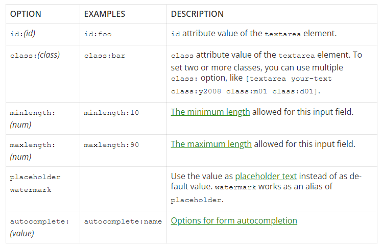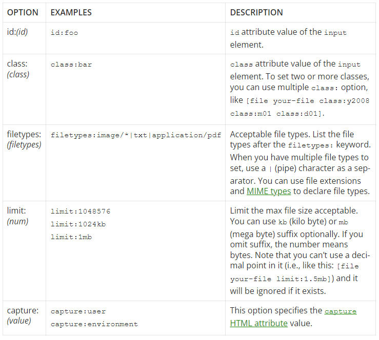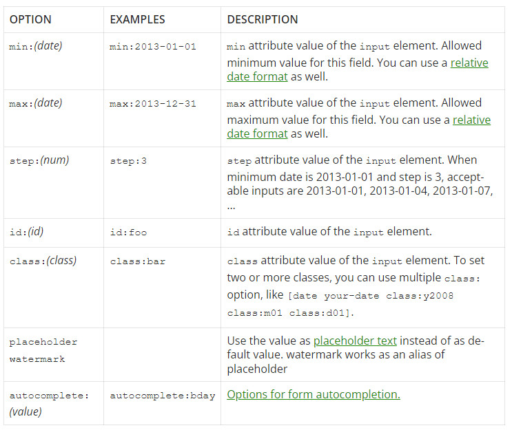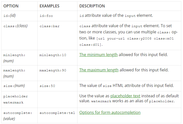 class:(class) class:bar class attribute value of the input element. To set two or more classes, you can use multiple class: option, like [acceptance accept-this class:y2008 class:m01 class:d01].
