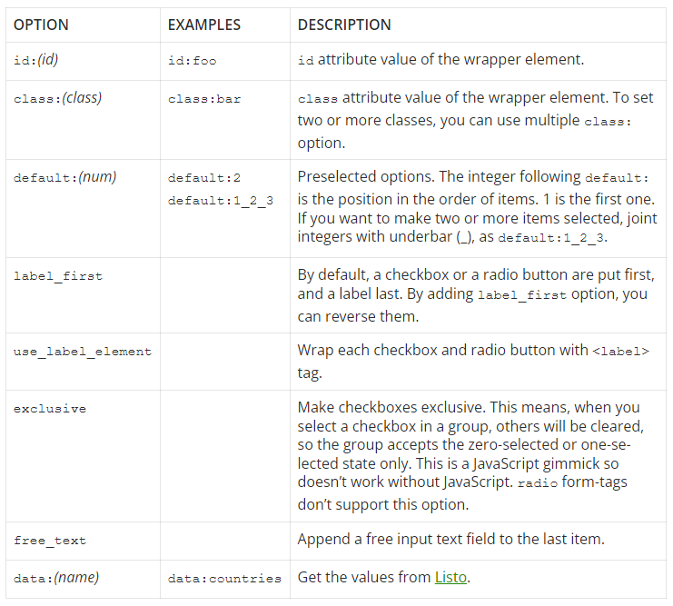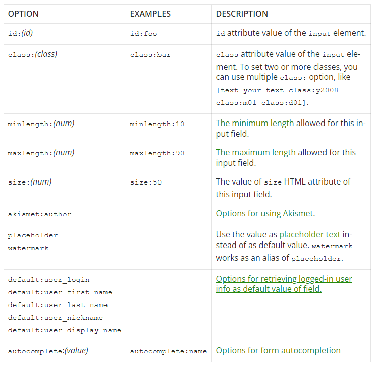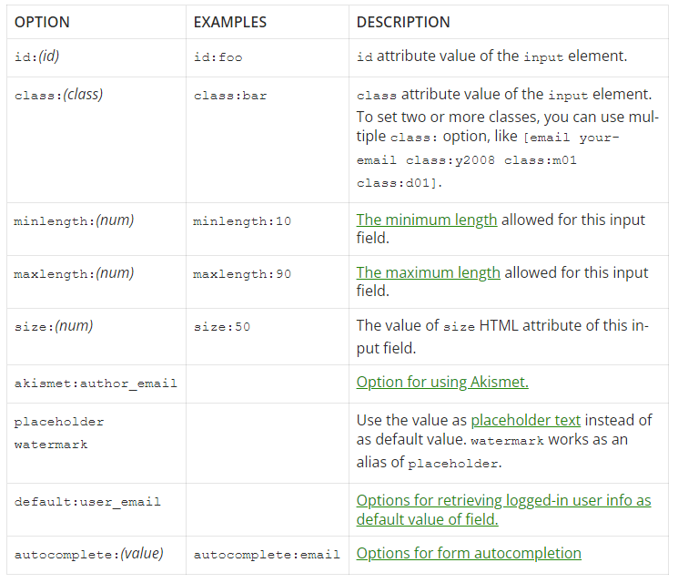 Available options for checkbox, checkbox* and radio – from https://contactform7.com/checkboxes-radio-buttons-and-menus/#checkbox-radio