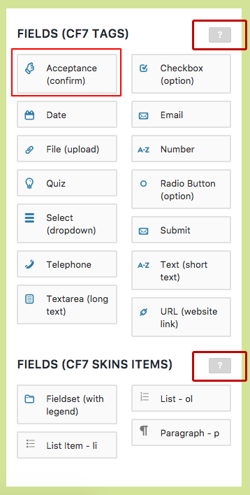 - ? – Holds single form field. Drag & drop them up and down to change the order they appear on your form. Every Contact Form 7 tag has its own LIST-LI item.