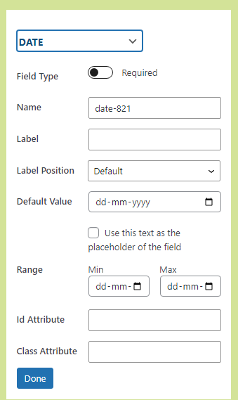 Edit the option, Field type (mandatory or optional), Name, Label, Label Position (top, bottom, left, or right), Default Value, Range (Range of date from which user can select date), ID Attribute (If any specific ID needs to be used for field) and Class Attribute (If any specific Class needs to be used for field).