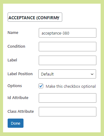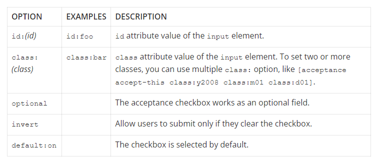 Available options for acceptance – from https://contactform7.com/acceptance-checkbox/