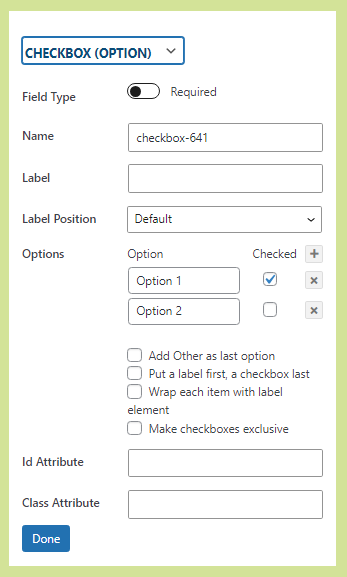 Edit the option, Field type (mandatory or optional), Name, Label, Label Position (top, bottom, left, or right), Options (value for the option and whether checkbox should be checked by default), ID Attribute (If any specific ID needs to be used for field) and Class Attribute (If any specific Class needs to be used for field).