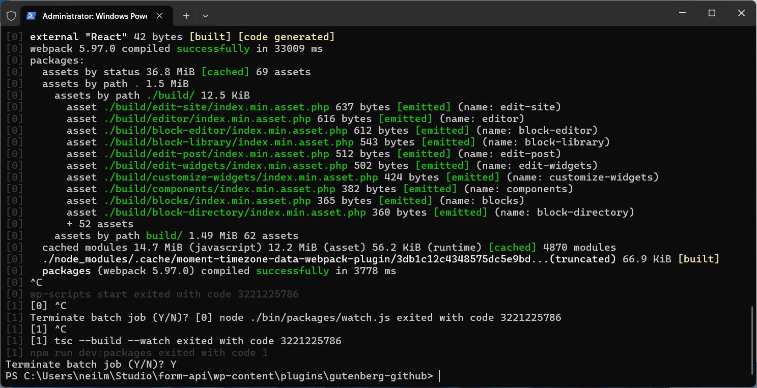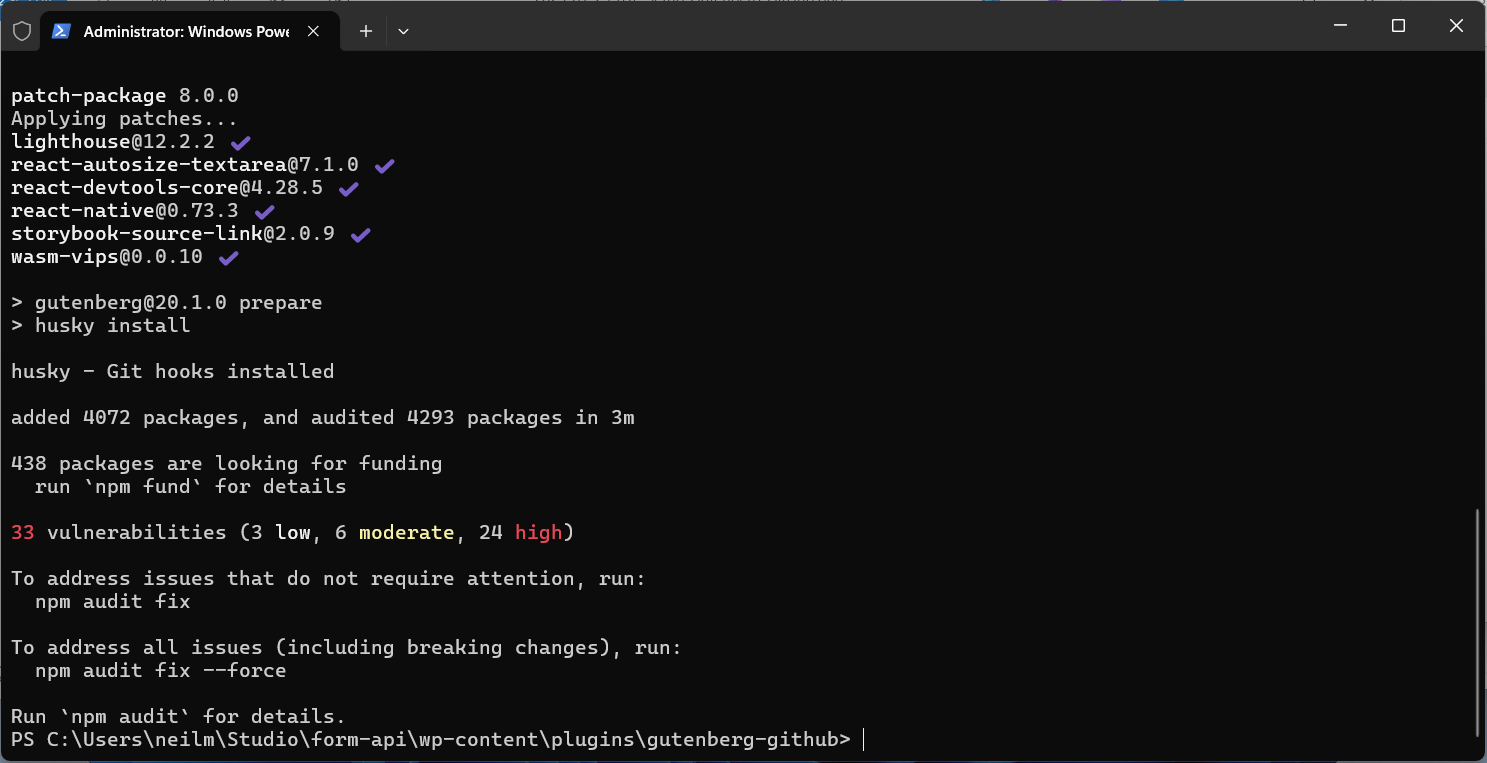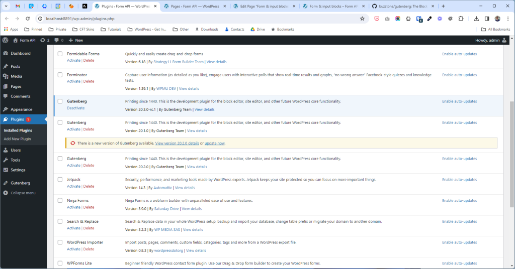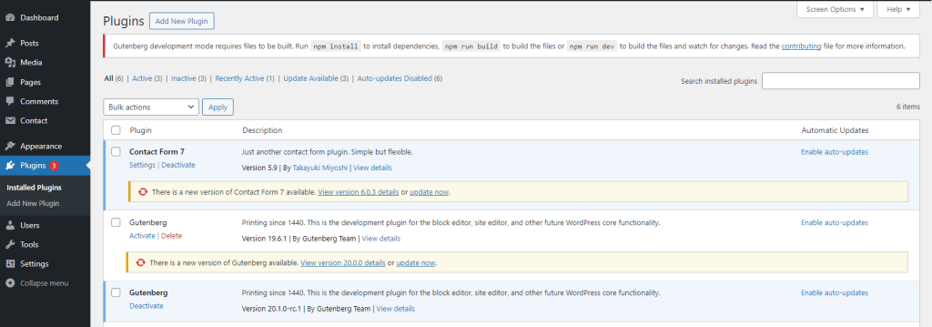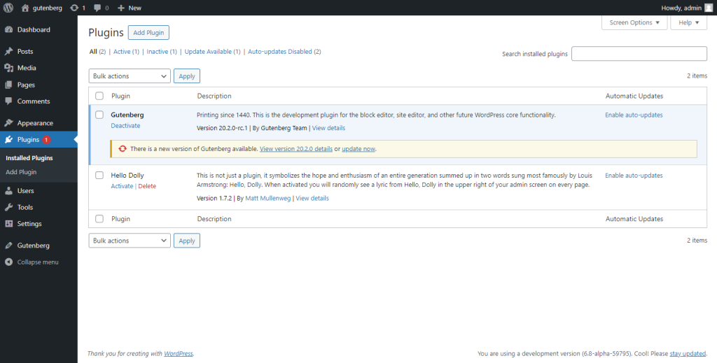 Once this completes correctly you’ll notice the Gutenberg plugin installed and activated, this is your local build.