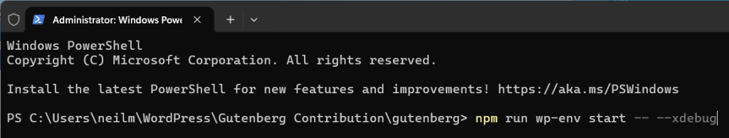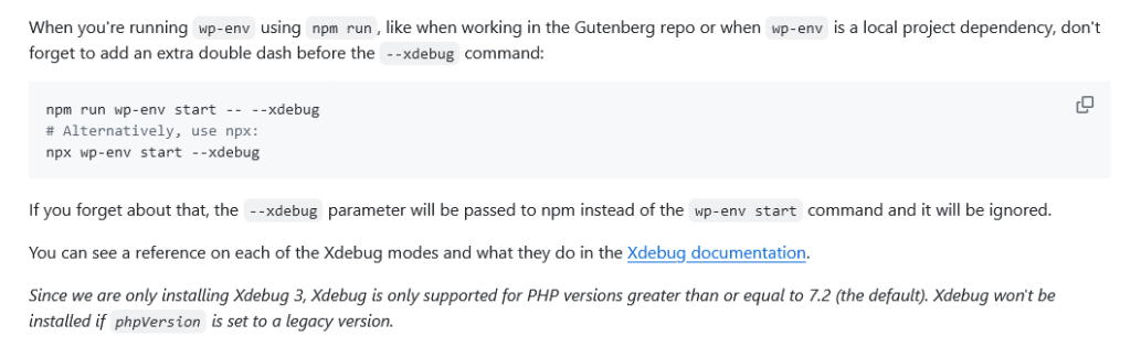 When working in the Gutenberg repo or when wp-env is a local project dependency, and you’re running wp-env using npm run, don’t forget to add an extra double dash before the --xdebug command: