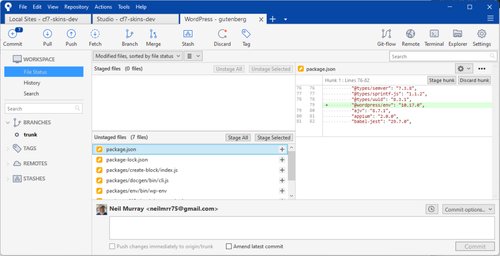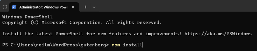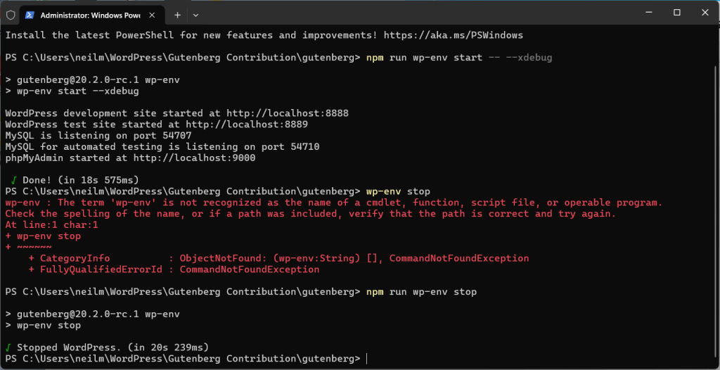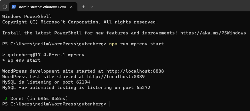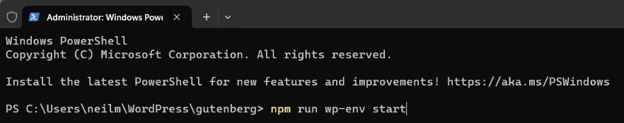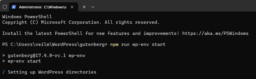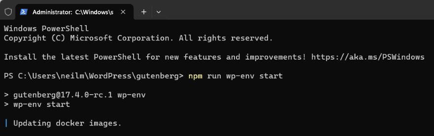 Make sure Docker Desktop is running, and start wp-env from within the directory where you’ve added your fork of the Gutenberg plugin.