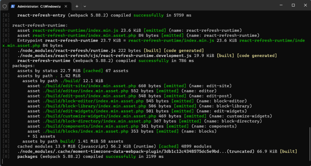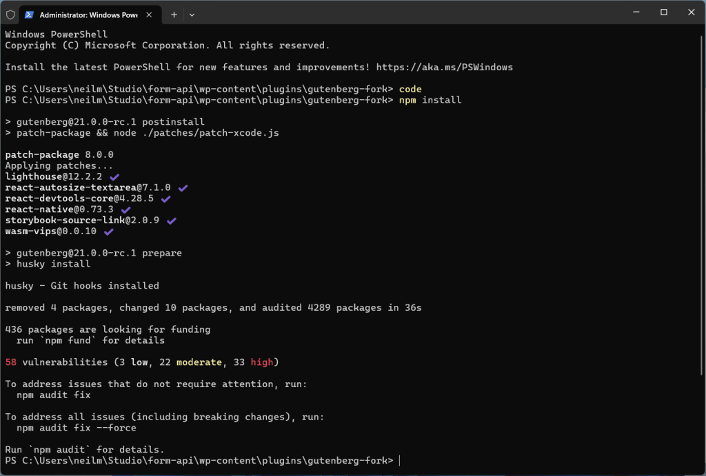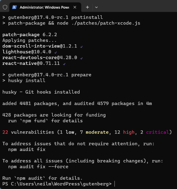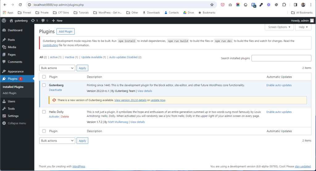 Once this completes correctly you’ll notice the Gutenberg plugin installed and activated, this is your local build.