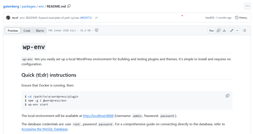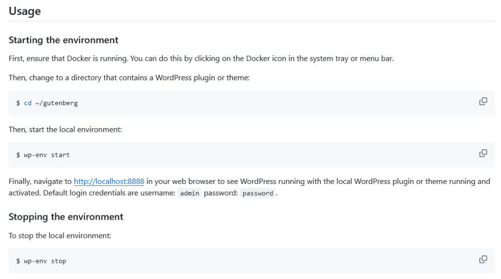 This script will create a Docker instance behind the scenes with the latest WordPress Docker image, and then will map the Gutenberg plugin code from your local copy to the environment as a Docker volume.