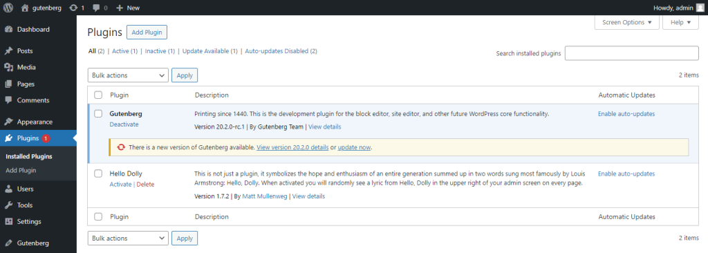 You’ll notice the Gutenberg plugin installed and activated.