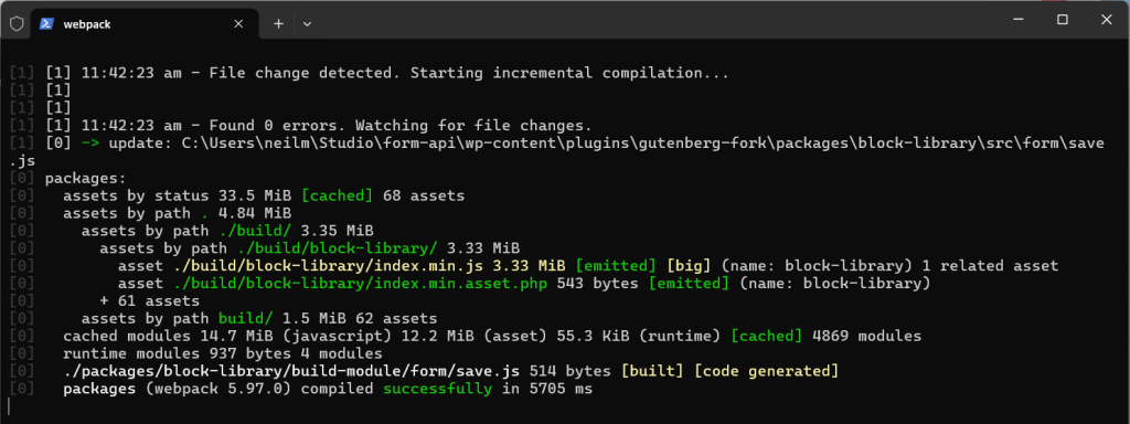 npm run devto run continuous builds automatically as source files change.The dev build also includes additional warnings and errors to help troubleshoot while developing.