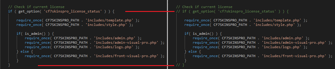 cf7-skins-pro/index.php with Plugin Editor and add double slash to opening and ending logic statement.