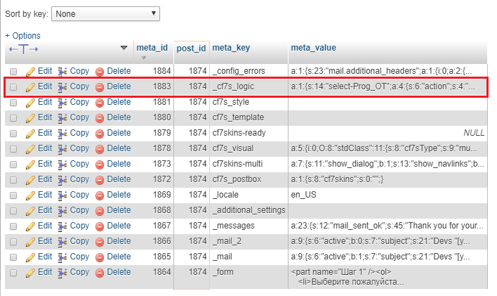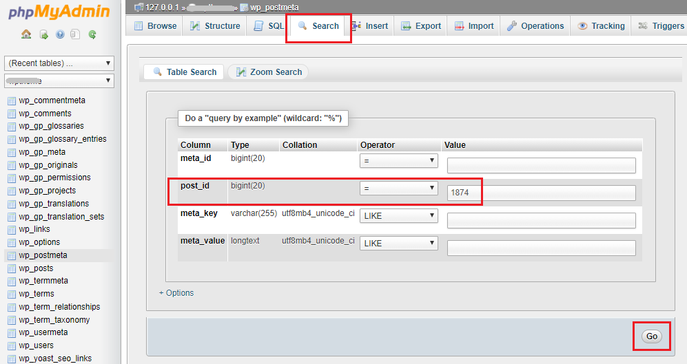 - Go to our local phpMyAdmin page, open wp_postmeta and do search by post_id.