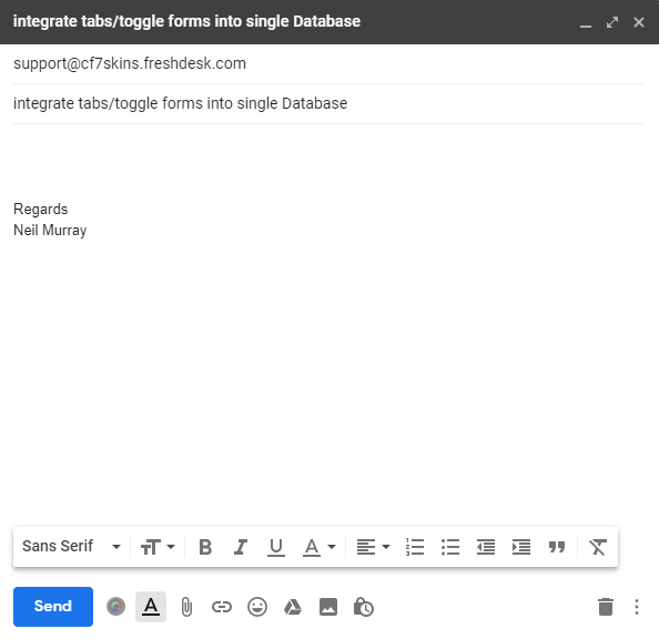 - Send email to support@cf7skins.freshdesk.com