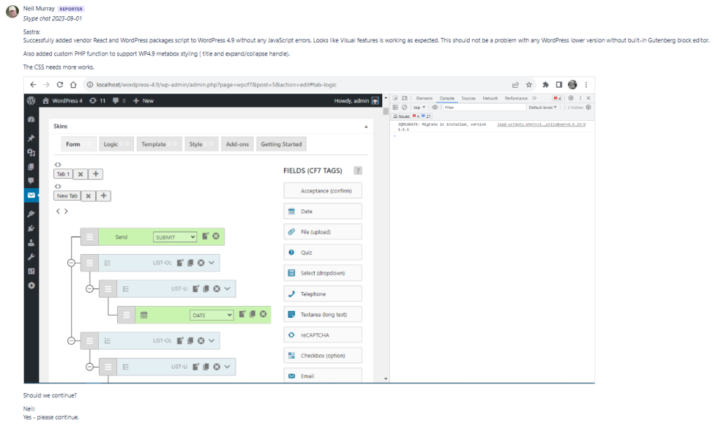 - Bitbucket Issues – add record of Skype chat when discussion finished.