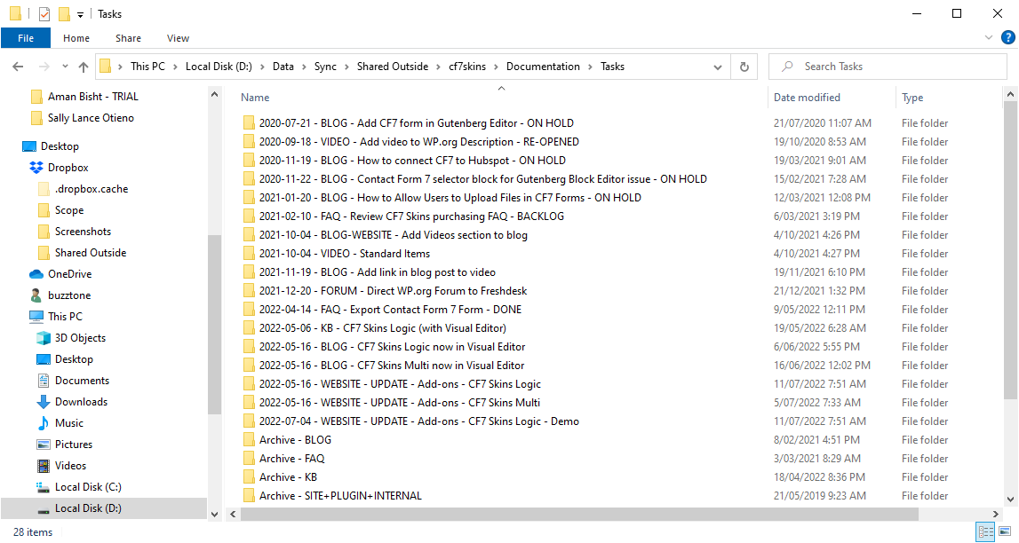 Each documentation task has a folder where all files are stored so they can be quickly & easily accessed by both you & others on the team.